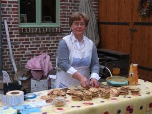 Pour faire ses gaufres, Elisabeth utilise du beurre , du lait, des œufs, de la farine, un peu de levure, de la cassonade, de la vanille, du rhum et un tour de main.
